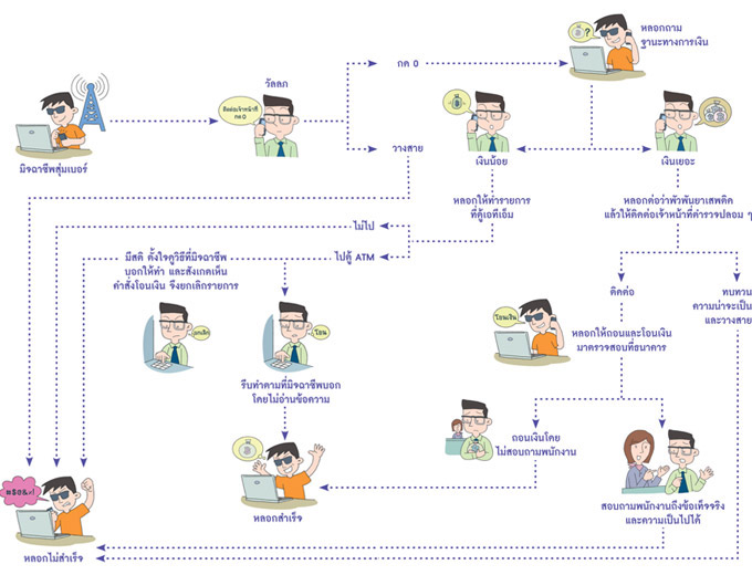 - ไม่ทำรายการตามคำบอกผ่านทางโทรศัพท์ แม้จะได้รับการบอกกล่าวว่าเป็นเจ้าหน้าที่ของรัฐ หรือสถาบันการเงิน เพราะหน่วยงานของรัฐและสถาบันการเงินไม่มีนโยบายสอบถามข้อมูลส่วนตัวลูกค้าหรือประชาชนผ่านทางโทรศัพท์