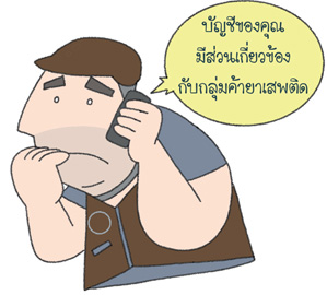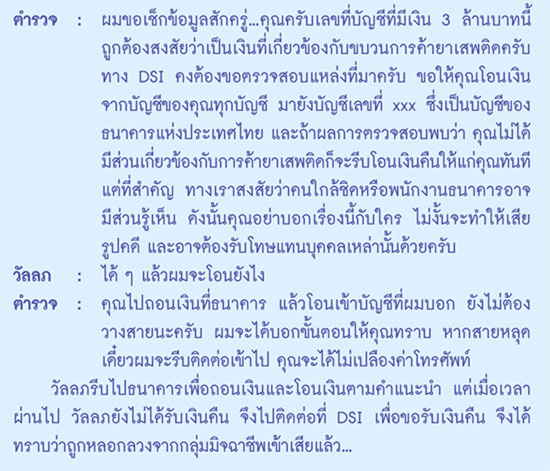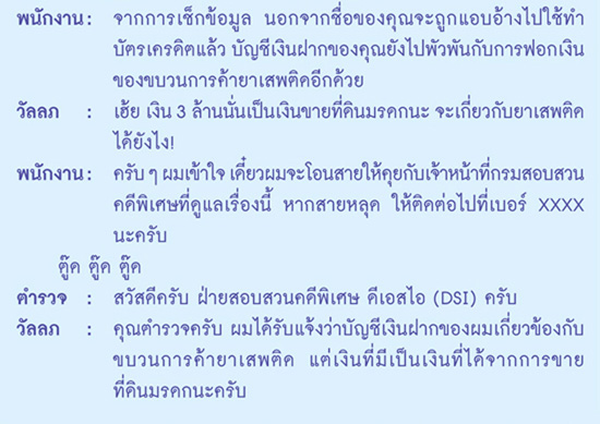 - บัญชีเงินฝากพัวพันกับขบวนการค้ายาเสพติด: อ้างว่าเป็นเจ้าหน้าที่ตำรวจ แจ้งว่ามีเงินโอนจากกลุ่มค้ายาเสพติดมายังบัญชีของเหยื่อแล้วให้โอนกลับ มิฉะนั้นจะถูกอายัดทุกบัญชี