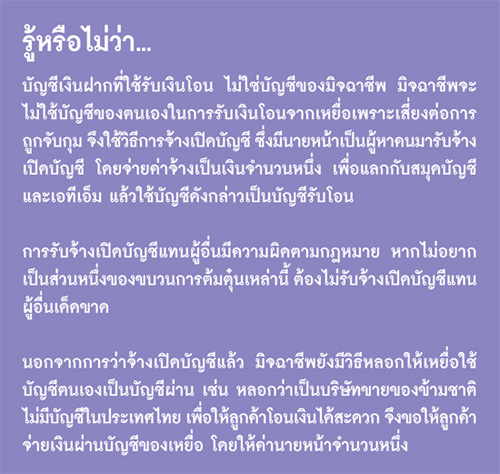- ไม่โลภอยากได้เงินรางวัลที่ไม่มีที่มา จำไว้ว่า "ของถูก ของดี ของฟรี ไม่มีในโลก" เผลอๆ อาจได้ของแถม เพราะเข้าไปพัวพันกับธุรกิจผิดกฎหมาย เช่น การฟอกเงินโดยไม่รู้ตัว