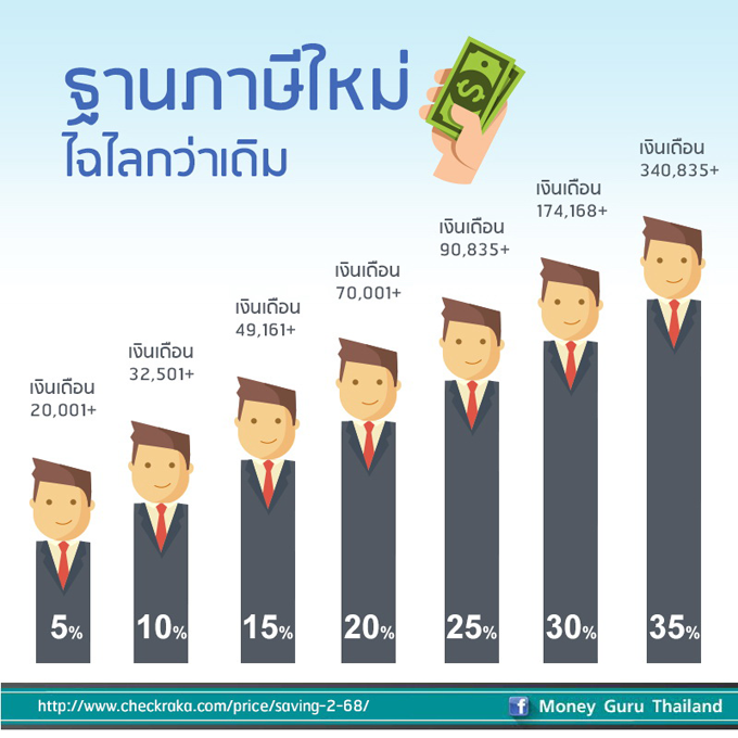 เมื่อพูดถึง "ภาษีเงินได้บุคคลธรรมดา" ผู้มีรายได้ทั้งหลายคงต้องเข้าใจตรงกันว่า การเสียภาษี คือหน้าที่ของผู้มีรายได้ที่จะต้องทำเป็นประจำทุกปี หรือเรียกว่า "เทศกาลการเสียภาษีประจำปี" และในปีนี้เทศกาลนี้ก็กำลังจะเวียนมาอีกรอบ โดยประชาชนทั่วไป ซึ่งรวมถึงพวกเราชาว CheckRaka.com ที่มีรายได้ทุกคน จะต้องทำหน้าที่อย่างพร้อมเพรียงกัน ไม่ว่าจะเต็มใจหรือไม่ก็ตาม พอใกล้สิ้นปีก็จะมีคนจำนวนไม่น้อยที่กระตือรือร้นในการหาวิธีมาลดหย่อนภาษี เช่น การซื้อกองทุน RMF-LTF หรือซื้อประกันชีวิต เป็นต้น เพื่อเป็นการแบ่งเบาภาระในการเสียภาษีให้น้อยที่สุด แต่ในปี พ.ศ. 2556 นี้ ประชาชนผู้มีรายได้ทุกคนได้รับข่าวดีจากรัฐบาล โดย ครม. ไฟเขียว พ.ร.ฎ.ปรับโครงสร้างภาษีเงินได้บุคคลธรรมดา โดยมีผลบังคับใช้ในปีภาษี 2556 ซึ่งจะใช้ในการคำนวณภาษีและยื่นแบบแสดงรายการเสียภาษีในเดือนมกราคม - มีนาคม 2557 โดยอัตราภาษีเงินได้บุคคลธรรมดาที่เปลี่ยนแปลงจากเดิม เป็นอัตราภาษีใหม่ ดังนี้