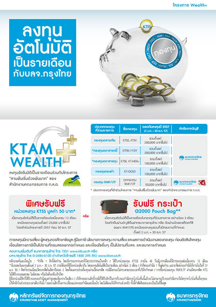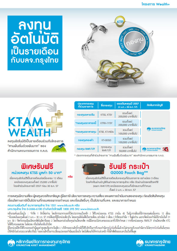 ลงทุนอัตโนมัติเป็นรายเดือนกับ บลจ.กรุงไทย - พิเศษ! รับฟรี หน่วยลงทุน KTSS มูลค่า 50 บาท*เมื่อลงทุนอัตโนมัติเป็นรายเดือนต่อเนื่องครบ 12 เดือน และมียอดลงทุนรวมตั้งแต่ 25,000 บาทขึ้นไป โดยเข้าร่วมโครงการปี 2557 ก่อน 30 ธ.ค.2557