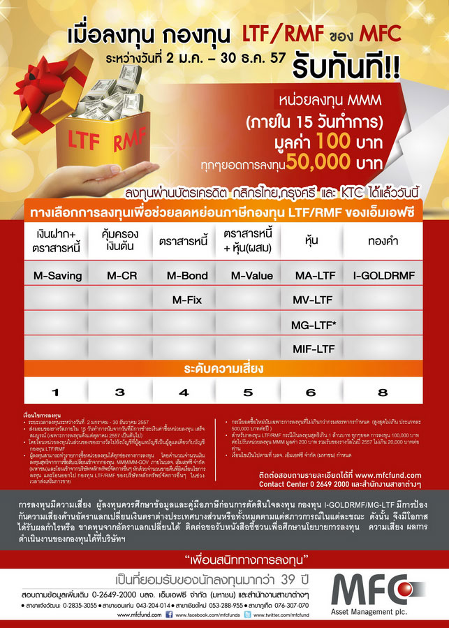 เมื่อลงทุน กองทุน LTF/RMF ของ MFC ระหว่างวันที่ 2 ม.ค.- 30 ธ.ค.57 รับทันที หน่วยลงทุน MMM (ภายใน 15 วันทำการ) มูลค่า 100 บาท ทุกๆ ยอดการลงทุน 50,000 บาท