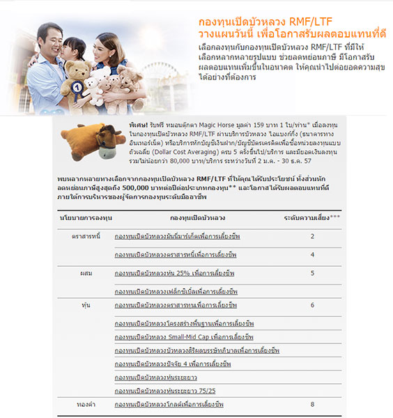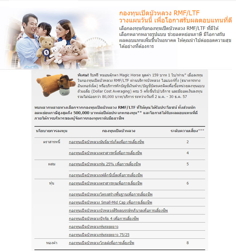 กองทุนเปิดบัวหลวง RMF/LTF วางแผนวันนี้ เพื่อโอกาสรับผลตอบแทนที่ดี พิเศษ! รับฟรี หมอนตุ๊กตา Magic Horse มูลค่า 150 บาท 1 ใบ/ท่าน* เมื่อลงทุนในกองทุนเปิดบัวหลวง RMF/LTF ผ่านบริการบัวหลวง ไอแบงก์กิ้ง หรือบริการหักบัญชีเงินฝาก/บัญชีบัตรเครดิตเพื่อซื้อหน่วยลงทุนแบบถัวเฉลี่ย (Dollar Cost Averaging) ครบ 5 ครั้งขึ้นไป/บริการ และมียอดเงินลงทุนรวมไม่น้อยกว่า 80,000 บาท/บริการ ระหว่างวันที่ 2 ม.ค.- 30 ธ.ค.57