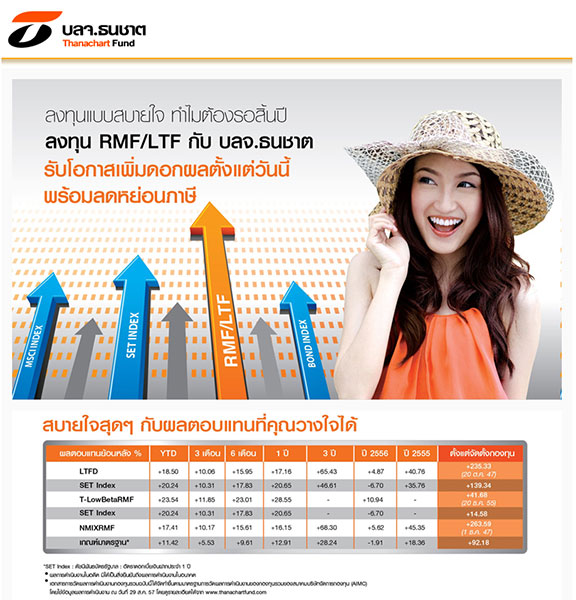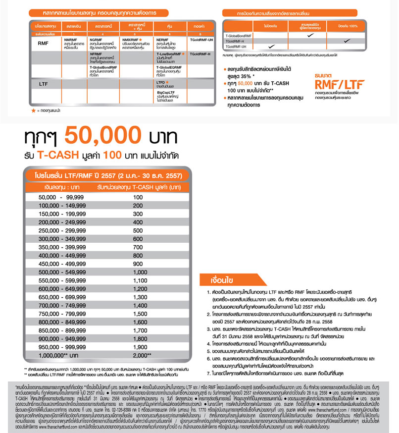 ลงทุนสบายใจ ทำไมต้องรอสิ้นปี ลงทุน RMF/LTF กับ บลจ.ธนชาต รับโอกาสเพิ่มดอกผลตั้งแต่วันนี้ พร้อมลดหย่อนภาษีลงทุนวันนี้ทุกๆ 50,000 บาท รับ T-CASH มูลค่า 100 บาท แบบไม่จำกัด