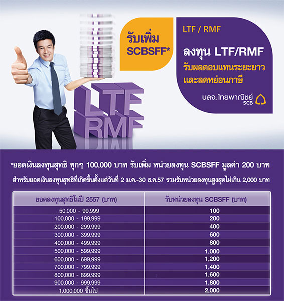 *ยอดเงินลงทุนสุทธิ ทุกๆ 100,000 บาท รับเพิ่ม หน่วยลงทุน SCBSFF มูลค่า 200 บาท สำหรับยอดเงินลงทุนสุทธิที่เกิดขึ้นตั้งแต่วันที่ 2 ม.ค.- 30 ธ.ค.57 รวมรับหน่วยลงทุนสูงสุดไม่เกิน 2,000 บาท