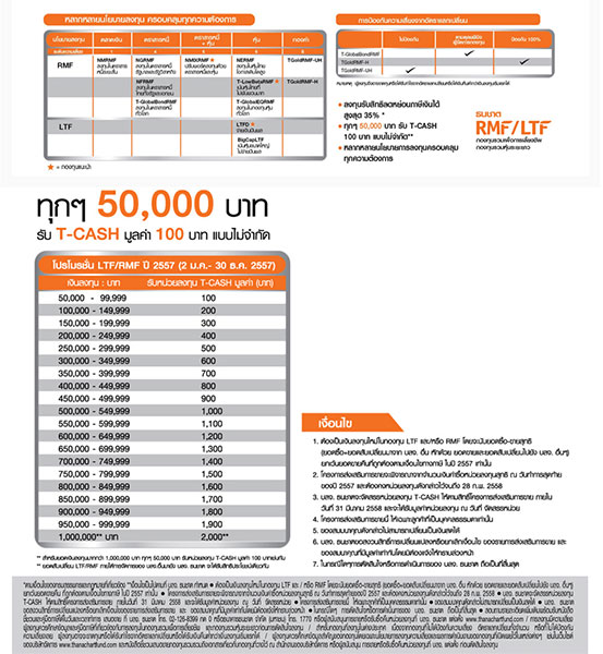 มองหา LTF/RMF ดีๆ มา TMB สิ มีให้เลือกเยอะ นอกจากประหยัดภาษีแล้ว ลงทุนวันนี้รับเงินคืนแบบไม่อั้น เพียงสะสมยอดเงินลงทุนสุทธิใน LTF/RMF ของแต่ละ บลจ. ทุกๆ 50,000 บาท รับเงินคืน 100 บาท (วันนี้ - 30 ธ.ค.57)