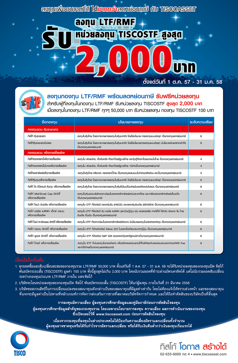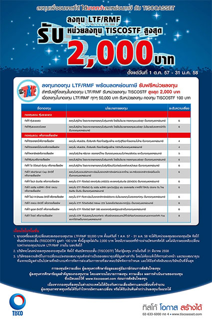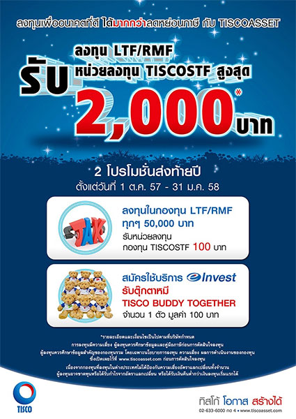 - ลงทุนในกองทุน LTF/RMF ทุกๆ 50,000 บาท รับหน่วยลงทุนกองทุน TISCOSTF 100 บาท