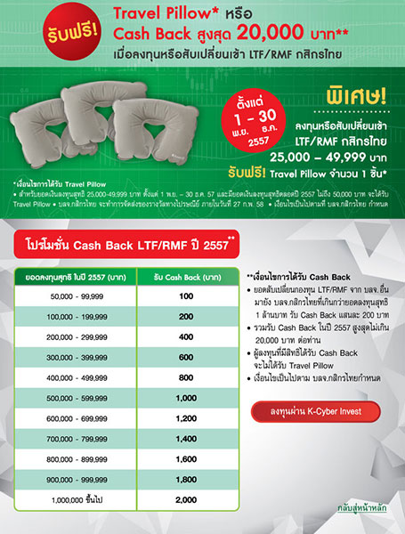 รับฟรี Travel Pillow* หรือ Cash Back สูงสุด 20,000 บาท** เมื่อลงทุนหรือสับเปลี่ยนเข้า LTF/RMF กสิกรไทย