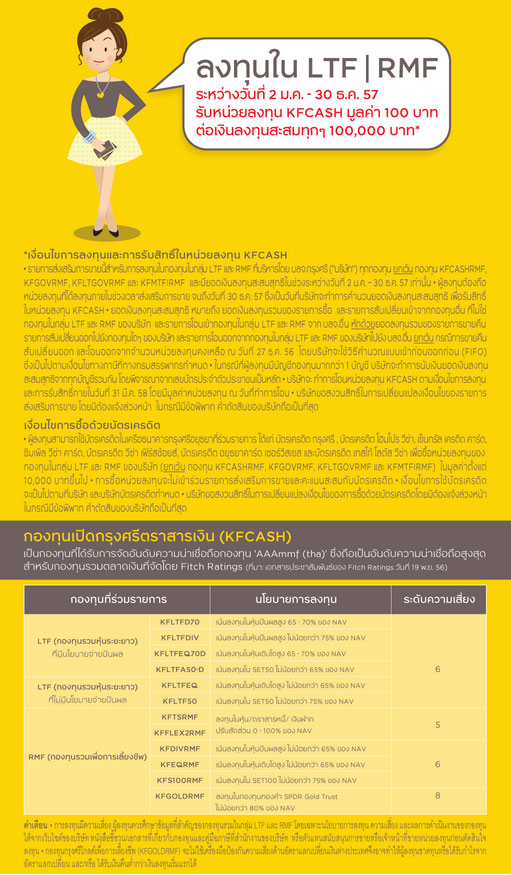 ลงทุนใน LTF/RMF ระหว่างวันที่ 2 ม.ค.- 30 ธ.ค.57 รับหน่วยลงทุน KFCASH มูลค่า 100 บาท ต่อเงินลงทุนสะสมทุกๆ 100,000 บาท*