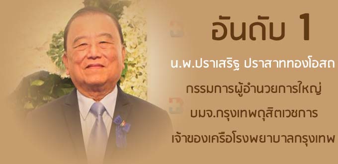 น.พ. ปราเสริฐ ปราสาททองโอสถ ถือครองหุ้นสูงสุดเป็นอันดับ 1 รวมมูลค่า 57,909.48 ล้านบาท รวยขึ้น 21,313.28 ล้านบาท หรือ 58.24% สำหรับหุ้นที่ถือครอง ประกอบด้วย หุ้น บมจ.กรุงเทพดุสิตเวชการ (BGH) หรือโรงพยาบาลกรุงเทพ รวมมูลค่า 57,866.71 ล้านบาท สัดส่วนการถือหุ้นได้เพิ่มขึ้นอีก 2.41% เป็น 20.19% นอกจากนี้ หมอเสริฐยังถือครองหุ้น บมจ.โรงพยาบาลนนทเวช (NTV) ในสัดส่วน 0.79% มูลค่า 42.77 ล้านบาท อีกด้วย