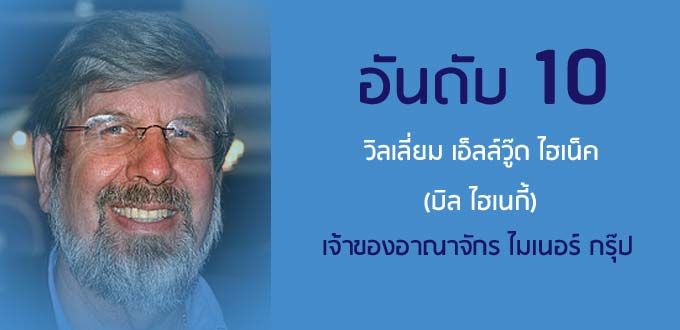 วิลเลี่ยม เอ็ลล์วู๊ด ไฮเน็ค หรือ บิล ไฮเนกี้ เจ้าของอาณาจักร ไมเนอร์ กรุ๊ป ร่วงมาจากอันดับ 8 เมื่อปีที่แล้ว มาอยู่ในอันดับ 10 ในปีนี้ โดยมีมูลค่าหุ้นที่ถือครองรวม 13,061.36 ล้านบาทเพิ่มขึ้น 1,860.74 ล้านบาท หรือ 16.61% ประกอบด้วย หุ้น บมจ.ไมเนอร์ อินเตอร์เนชั่นแนล (MINT) 8.55% มูลค่า 12,660.44 ล้านบาท และหุ้น บมจ.คริสเตียนี และนีลเส็น (ไทย) (CNT) ในสัดส่วน 6.61% มูลค่า 400.90 ล้านบาท