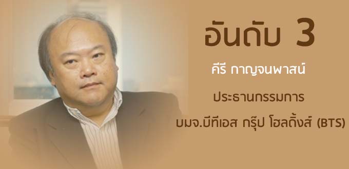 คีรี กาญจนพาสน์ ประธานกรรมการ บมจ.บีทีเอส กรุ๊ป โฮลดิ้งส์ (BTS) ร่วงลงมาจากอันดับ 2 เมื่อปีที่แล้ว หุ้นถือครองรวมมูลค่าทั้งสิ้น 39,200.03 ล้านบาท เพิ่มขึ้น 4,980.24 ล้านบาท หรือ 14.55% ประกอบด้วย หุ้น BTS ในสัดส่วน 32.58% มูลค่า 38,811.65 ล้านบาท หุ้น บมจ.แสนสิริ (SIRI) 0.6% มูลค่า 129.92 ล้านบาท และหุ้น บมจ. วี จี ไอ โกลบอล มีเดีย (VGI) 0.54% มูลค่า 258.46 ล้านบาท