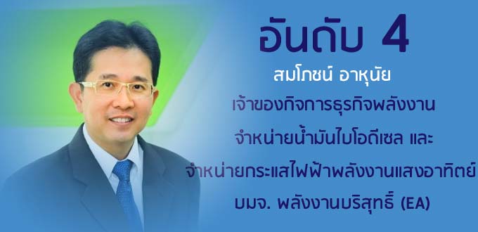 สมโภชน์ อาหุนัย เจ้าของกิจการธุรกิจพลังงาน EA กระโดดจากอันดับ 10 ในปีที่แล้ว มาอยู่ในอันดับ 4 จากความร้อนแรงของหุ้น EA ที่ราคาปรับตัวสูงขึ้นอย่างต่อเนื่อง โดยถือครองหุ้นรวมมูลค่า 36,565.50 ล้านบาท รวมเพิ่มขึ้นถึง 26,429.71 ล้านบาท หรือ 260.76% ถือหุ้น EA ในสัดส่วน 40.47% มูลค่า 36,533.78 ล้านบาท และหุ้น บมจ. อีเทอเนิล เอนเนอยี (EE) อีก 0.94% มูลค่า 31.72 ล้านบาท