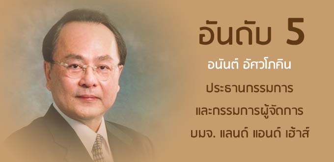 อนันต์ อัศวโภคิน ประธานกรรมการ และกรรมการผู้จัดการ บมจ.แลนด์ แอนด์ เฮ้าส์ หล่นจากอันดับ 4 ลงมาอยู่อันดับ 5 โดยถือครองหุ้นมูลค่ารวม 24,788.62 ล้านบาท ลดลง 952.14 ล้านบาท หรือ 3.70% ประกอบด้วย หุ้น บมจ.แลนด์ แอนด์ เฮ้าส์ (LH) 22.07% มูลค่า 24,779.45 ล้านบาท และบมจ.แมนดาริน โฮเต็ล (MANRIN) 1.36% มูลค่า 9.16 ล้านบาท