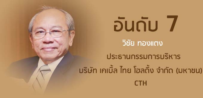 วิชัย ทองแตง ประธานกรรมการบริษัท เคเบิ้ล ไทย โฮลดิ้ง จำกัด (มหาชน) CTH ร่วงจากอันดับ 6 เมื่อปีที่แล้ว มาอยู่ในอันดับ 7 ในปีนี้ ถือครองหุ้นรวมมูลค่า 20,294.77 ล้านบาท เพิ่มขึ้น 165.46 ล้านบาท หรือ 0.82% ประกอบด้วยหุ้น BGH ในสัดส่วน 6.71% มูลค่า 19,235.87 ล้านบาท หุ้น บมจ.ฟอร์ท คอร์ปอเรชั่น (FORTH) 7.23% มูลค่า 454.59 ล้านบาท หุ้น บมจ.ปุ๋ยเอ็นเอฟซี (NFC) 8.04% มูลค่า 272 ล้านบาท และหุ้น บมจ.อาร์พีซี (RPC) 21.40% มูลค่า 332.31 ล้านบาท