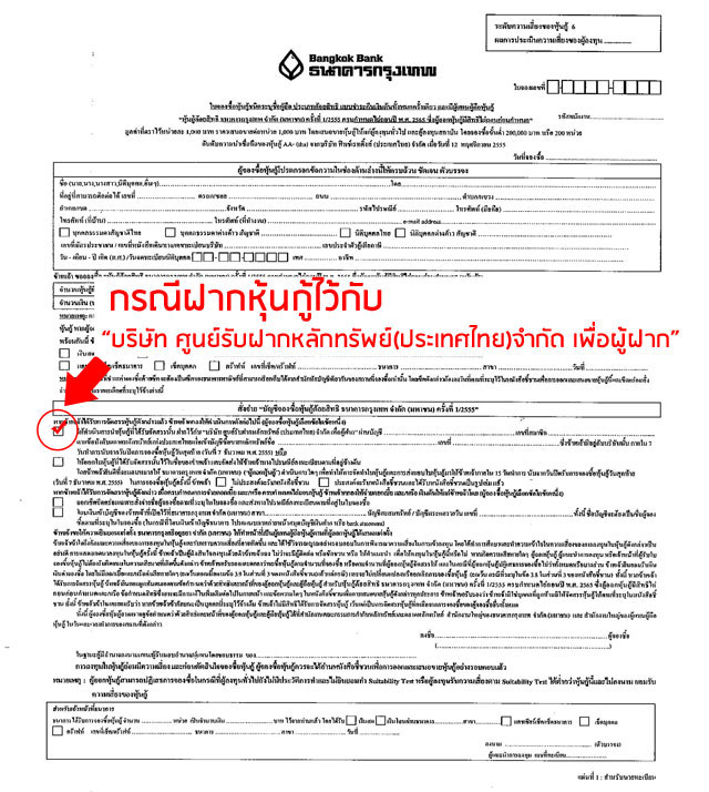 (ข) โดยการขายในตลาดตราสารหนี้ (Bond Electronic Exchange หรือ BEX) ซึ่งเป็นตลาดรอง (ต้องเป็นบริษัทหลักทรัพย์ที่ได้รับอนุญาตเท่านั้นนะคะ) วิธีนี้เราจะทำได้ต่อเมื่อเราต้องกรอกใน "ใบจองซื้อหุ้นกู้" ตั้งแต่แรกเลยว่า เราขอฝากหุ้นกู้นี้กับศูนย์รับฝากหลักทรัพย์ผ่าน Broker ของเรา เพื่อให้นำเข้าตลาดไปซื้อขายได้ต่อไป (ตามตัวอย่างข้างล่าง)