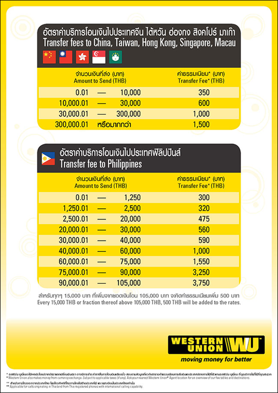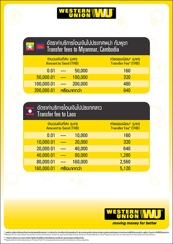 ตัวอย่าง อัตราค่าธรรมเนียมบริการโอนเงินผ่านระบบ Western Union