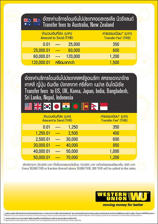 ค่าธรรมเนียมโอนเงินผ่านระบบ MoneyGram ไปทุกประเทศ ยกเว้น ประเทศฟิลิปปินส์, สหรัฐอเมริกา, สหราชอาณาจักร, สิงคโปร์, เกาหลีใต้, ญี่ปุ่น, อินเดีย, จีน, ฮ่องกง |
