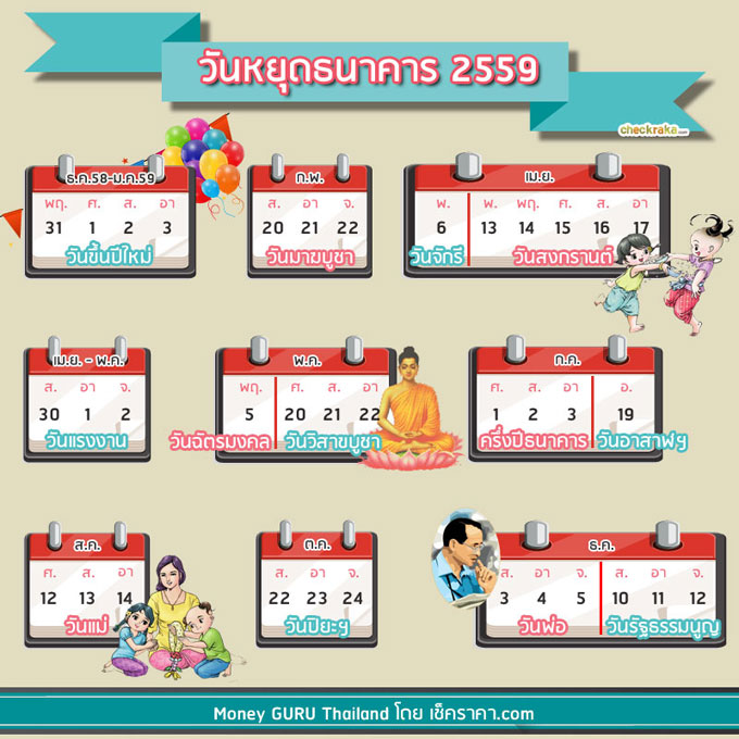 การไปทำธุรกรรมที่ธนาคาร ไม่ใช่ว่าอยากไปวันไหนก็ไปได้นะคะ ธนาคารเค้าก็มีวันหยุดเหมือนกัน หลายคนคงเคยเจอปัญหาเกี่ยวกับการไปทำธุรกรรมที่ธนาคาร บางคนเตรียมตัวไปเป็นอย่างดี แต่พอไปถึงธนาคารถึงกับต้อง "อึ้งกิมกี่!" เมื่อเจอกับป้ายที่ติดอยู่ด้านหน้าว่า "วันหยุดธนาคาร" หรือที่เจ้าหน้าที่ธนาคารชอบบอกกับเราว่า "ธนาคารปิดจ้า" หากต้องเป็นแบบนี้ จะดีกว่ามั้ย...ถ้าเรารู้ก่อนว่าธนาคารจะหยุดให้บริการวันไหนบ้าง? แต่เอ๊ะ!!! แล้ววันหยุดธนาคารจะเหมือนกับวันหยุดของทางราชการหรือไม่? วันนี้เรามีคำตอบมาให้เพื่อนๆ ได้เก็บไว้ดูตลอดปี 2559 นี้เลยค่ะ (จะได้ไม่เป็นแม่สายบัวแต่งตัวเก้อ!)
