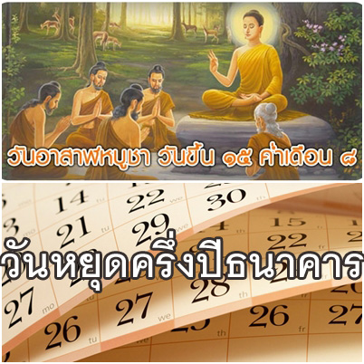 เดินทางมาถึงเดือนกรกฎาคมก็ครึ่งปีแล้วนะคะ...รู้กันมั้ยค่ะว่า ธนาคารมีวันหยุดที่ใช้ชื่อว่า "วันหยุดภาคครึ่งปี" ซึ่งตรงกับวันศุกร์ที่ 1 กรกฎาคม 2559 ในวันนี้ไม่มีใครหยุดนะคะ (ราชการหรือบริษัทเอกชน) มีเฉพาะธนาคารเท่านั้น และในวันนี้เองที่ทำให้หลายคนไปทำธุรกรรมที่ธนาคารแล้วเก้อ! ปีนี้พนักงานธนาคารก็จะได้หยุดต่อเนื่องนาน 3 วันจากวันศุกร์ที่ 1 - วันอาทิตย์ที่ 3 กรกฎาคม 2559 และที่ลืมไม่ได้อีกวันซึ่งเป็นวันที่มีความสำคัญทางศาสนาพุทธก็คือวันอังคารที่ 19 กรกฎาคม 2559 เป็น "วันอาสาฬหบูชา" โดยทำให้ธนาคารต้องหยุดทำการในวันนี้ด้วย