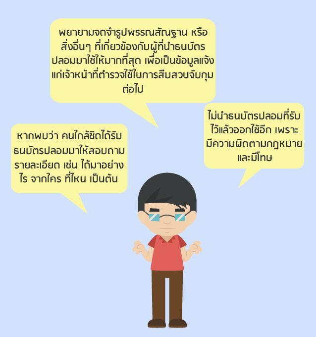 รีบแจ้งเจ้าหน้าที่ตำรวจที่อยู่ใกล้ที่เกิดเหตุ หรือแจ้งไปยังสถานีตำรวจท้องที่โดยด่วน หรือแจ้งที่ธนาคารแห่งประเทศไทย โทร. 0-2356-7987 เพื่อดำเนินการติดตามตัวมิจฉาชีพต่อไป