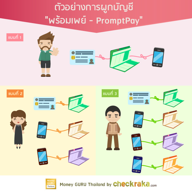 เลขบัตรประจำตัวประชาชน ผูกได้กับ บัญชีเงินฝาก 1 บัญชีเท่านั้น เบอร์โทรศัพท์มือถือ 1 เบอร์ ผูกได้กับ บัญชีเงินฝาก 1 บัญชีเท่านั้น บัญชีเงินฝาก 1 บัญชี สามารถผูกกับเบอร์โทรศัพท์มือถือได้สูงสุดตามที่ธนาคารแต่ละแห่งกำหนด บัญชีเงินฝากธนาคาร 1 บัญชี ผูกได้กับ ทั้งเลขประจำตัวประชาชน และหมายเลขโทรศัพท์มือถือ พูดง่ายๆ ก็คือ