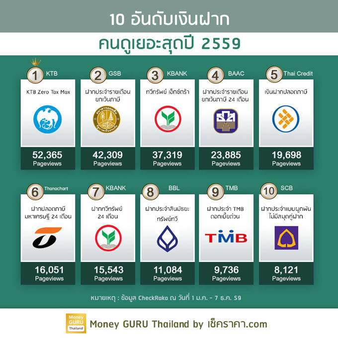 สุดท้าย ท้ายสุด ส่งท้ายปี 2559 ทาง CheckRaka จะไม่พลาดที่จะจัดอันดับสุดยอดบัญชีเงินฝากที่ได้รับสนใจมากที่สุด กับบทความ 10 อันดับ เงินฝากคนดูเยอะสุด ปี 2559 จากการเก็บสถิติบนเว็บไซค์ CheckRaka.com ตั้งแต่เดือนมกราคม - ธันวาคม 2559 (เป็นการเก็บสถิติจากวันที่ 1 ม.ค. - 7 ธ.ค. 59) มาฝากเพื่อนๆ ได้ดูกันว่าผลิตภัณฑ์ "บัญชีเงินฝาก" ตัวไหน? และของธนาคารอะไร? ที่คนเข้าดูเยอะที่สุด 10 อันดับแรก ไปดูกันเลยค่ะ