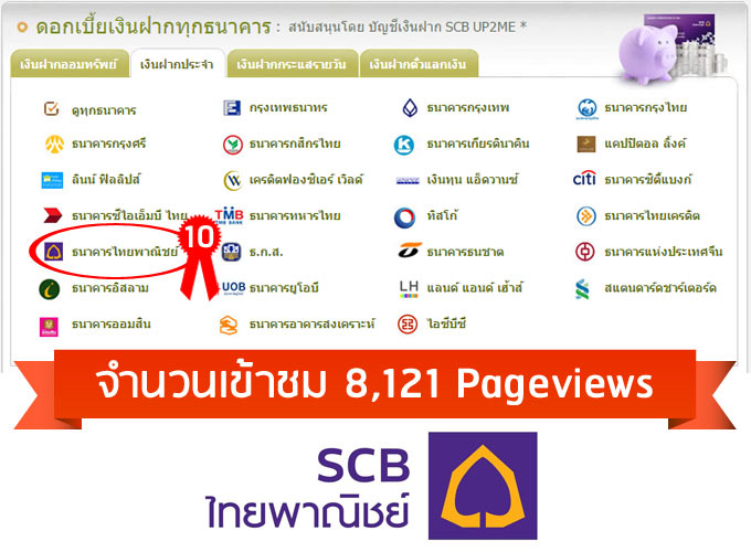 รั้งท้าย อันดับ 10 ด้วย "บัญชีเงินฝากประจำแบบผูกพัน แบบไม่มีสมุดคู่ฝาก (E PASSBOOK)" จากธนาคารไทยพาณิชย์ (SCB) โดยมีคนเข้าชมทั้งหมด 8,121 Pageviews ซึ่งปัจจุบันธนาคารไทยพาณิชย์ได้มีผลิตภัณฑ์เงินฝากดอกเบี้ยสูงออกมาดึงดูดลูกค้าอย่างต่อเนื่อง