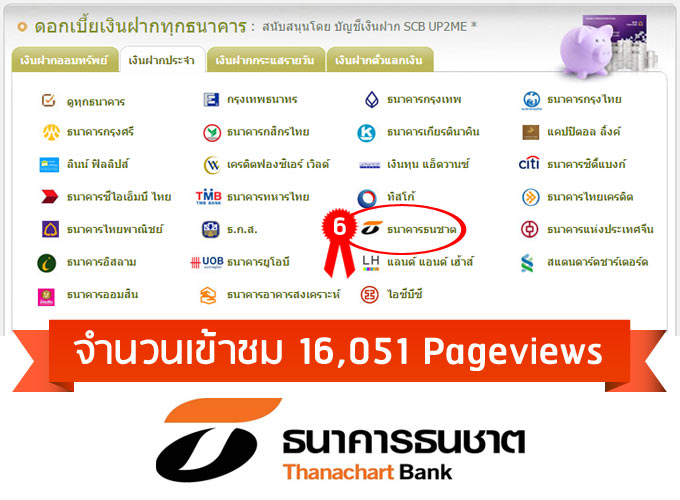 อันดับ 6 ในปีนี้ ตกเป็นของธนาคารธนชาต (Thanachart) กับ "บัญชีเงินฝากปลอดภาษีมหาเศรษฐี 24 เดือน" แค่ชื่อบัญชีก็ดูเป็นมงคลแล้ว อาจจะเป็นไปได้ว่าเพราะชื่อบัญชีนี้เอง จึงทำให้มีคนสนใจที่จะเข้าชมมากถึงอันดับ 6 ซึ่งมีคนเข้าชมมากถึง 16,051 Pageviews