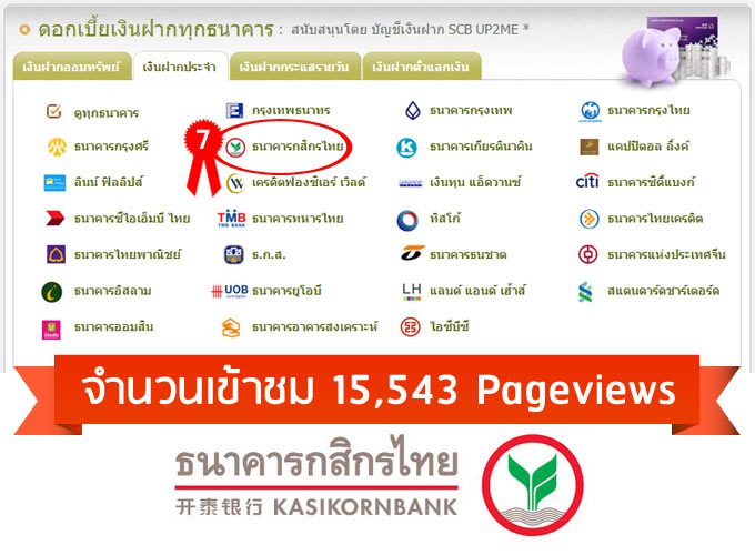 "บัญชีเงินฝากทวีทรัพย์ 24 เดือน" ธนาคารกสิกรไทย จัดอยู่ในอันดับ 7 ที่มีคนเข้าชมตลอดทั้งปีอยู่ที่ 15,543 Pageviews กสิกรไทย ถือได้ว่าเป็นอีกหนึ่งธนาคารที่ได้รับความนิยมอย่างต่อเนื่อง ด้วยผลิตภัณฑ์ที่มีออกมาอย่างหลากหลาย และให้ดอกเบี้ยเป็นที่น่าพอใจ จึงทำให้ในปีนี้ติดอยู่ในการจัดอันดับถึง 2 อันดับด้วยกัน ซึ่งได้แก่อันดับที่ 3 และอันดับที่ 7 นั่นเอง