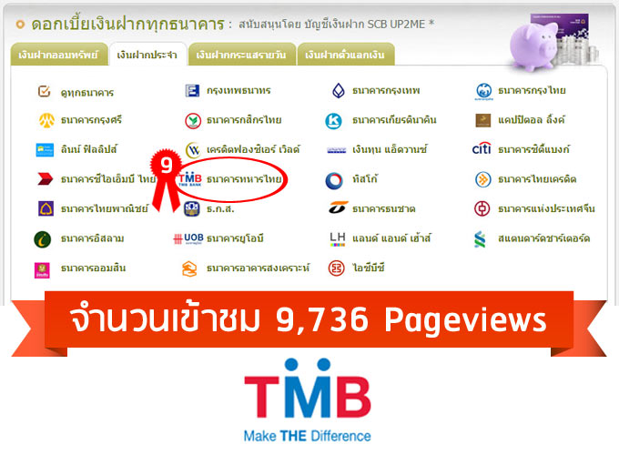 ธนาคารทหารไทย มีบัญชีเงินฝากดอกเบี้ยสูงหลากหลายบัญชีให้เลือก และในปีนี้ "บัญชีฝากประจำ TMB ดอกเบี้ยด่วน" ก็ได้เข้ามาครองตำแหน่งอยู่ในอันดับที่ 9 ที่มีคนสนใจเข้าชมมากถึง 9,736 Pageviews