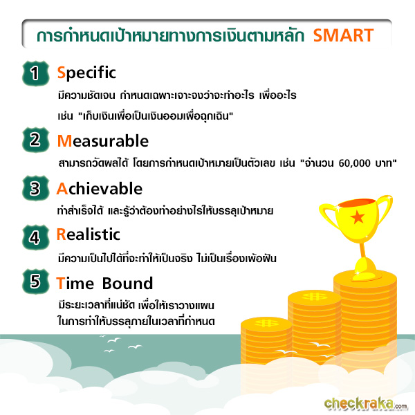 แต่สิ่งสำคัญคือ เราต้องจัดลำดับเป้าหมายของเรา หากเป้าหมายใดจำเป็นก็ควรเร่งทำก่อน เป้าหมายไหนไม่สำคัญมากก็สามารถเลื่อนออกไปได้นะคะ เราลองมาดูการตั้งเป้าหมายทางการเงินด้วยหลัก SMART กันดีกว่าค่ะ เผื่อจะได้ใช้เป็นแนวทางกันนะคะ