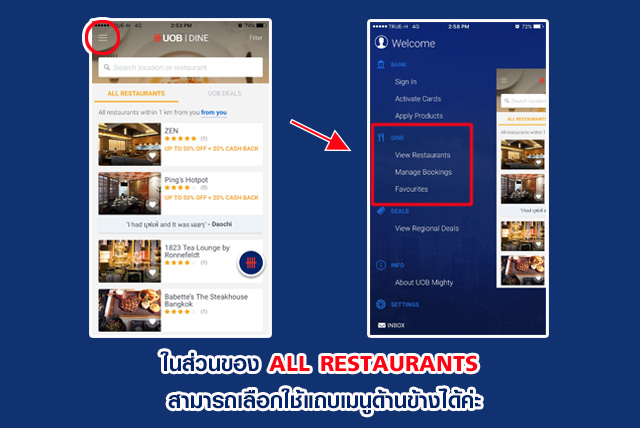 ด้านล่างของหน้าจอแอพพลิเคชั่นในส่วนของ DINE อยู่ Icon ที่ 2 เข้าไปแล้วเป็นอย่างไรบ้าง มีอะไรน่าสนใจ ไปดูกันเลยค่ะ