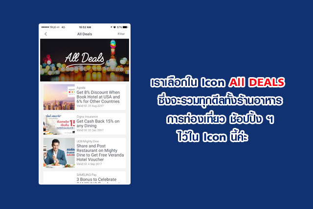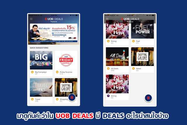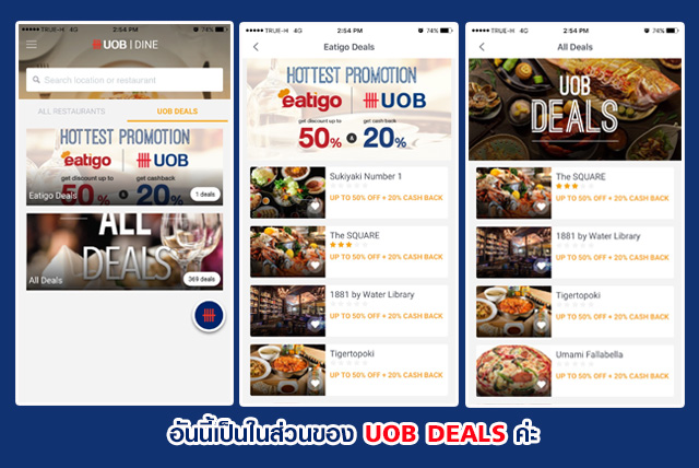ในส่วนของ UOB DEALS จะแสดง HOTTEST PROMOTION ของธนาคารยูโอบีที่ร่วมกับ eatigo ซึ่งเป็น Deals พิเศษ และรวม Deals ทั้งหมดให้เราเลือกใช้ได้มากมายเลยค่ะ ว้าวๆ ทั้งนั้นลองเข้าไปเลือกใช้ดูนะคะ