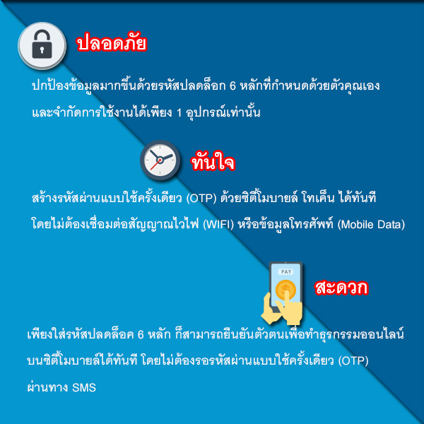 3. การซื้อสินค้าออนไลน์ (ซึ่งจะสามารถใช้งานได้ในเร็วๆ นี้) : เมื่อเราต้องการขอรับรหัสผ่านแบบใช้ครั้งเดียว (OTP) เพื่อยืนยันตัวตนในการซื้อสินค้าออนไลน์ เราสามารถใช้รหัสปลดล็อค 6 หลัก ในการสร้าง OTP ด้วยตัวเราเอง โดยไม่ต้องรอ OTP ผ่านทาง SMS