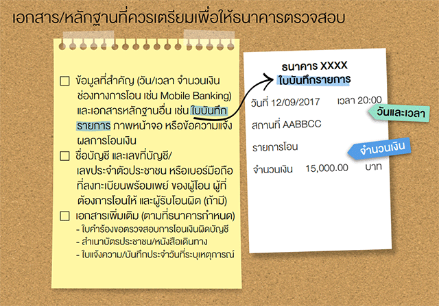 - รายการโอนเงิน ให้ส่งหลักฐานไปยังธนาคารเจ้าของบัญชีผู้โอน
