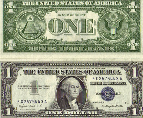 ธนบัตร 1 ดอลลาร์ บนด้านหนึ่งจะมีภาพของ จอร์จ วอชิงตัน ประธานาธิบดีคนแรกที่สื่อถึงความเป็นผู้นำที่สำเร็จ ส่วนอีกด้านหนึ่งมีพีระมิดที่มีดวงตาอยู่บนยอด กับรูปนกอินทรีย์ซึ่งเป็นสัญลักษณ์ของประเทศ ก็เป็นสัญลักษณ์ชั้นยอดแห่งการปกป้องคุ้มครอง นกอินทรีย์ก็เหมือนหงส์ที่มีชีวิตเป็นอมตะ เมื่อตายไปแล้วก็สามารถฟื้นคืนชีพจากเถ้าถ่านได้ทันที และนกอินทรีย์ก็ยังเป็นสัญลักษณ์ของโอกาสมากมาย และความกล้าหาญอีกด้วย พีระมิดสื่อถึงประเทศ ที่มีการวางรากฐานอย่างมั่นคงจากฐานรากแล้วเจริญเติบโตขึ้นเรื่อยๆ จนไปสู่ยอด คือความเป็นมหาอำนาจในโลกนั่นเอง ดวงตา เชื่อกันว่า เป็นดวงตามแห่งเทพฮอรัส เทพนักรบผู้กล้าหาญ และจอมเวทย์ที่มีเศียรเป็นนกเหยี่ยวในอียิปต์โบราณ ที่ทรงพลังอำนาจในการปกป้องคุ้มครอง จะเห็นได้ว่าสหรัฐให้ความสำคัญกับสัญลักษณ์ทั้งหมดที่อยู่บนธนบัตร 1 ดอลลาร์ ดังนั้น คำตอบคือ เฮง และร่ำรวยแน่นอน