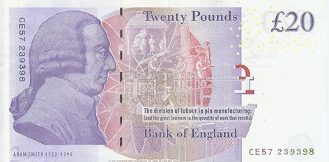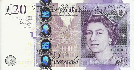 เงินปอนด์อังกฤษ ก็ให้ความสำคัญในการออกแบบโดยใช้สัญลักษณ์ที่เป็นมงคลเช่นกัน โดยเฉพาะกับบุคคลชั้นนำของประเทศ ร่วมกับสัญลักษณ์มงคลอื่นที่สื่อถึงความมั่งคั่งร่ำรวย ความมีอำนาจ และโอกาสใหม่ที่ดี อย่างเช่น ธนบัตร 20 ปอนด์ ด้านหนึ่งของธนบัตรได้อัญเชิญพระฉายาลักษณ์ของพระราชินี ฉลองพระองค์เต็มยศทรงมงกุฎที่ตกแต่งด้วยอัญมณีหรูหราครบเครื่อง และองค์ของราชินีเองก็ถือเป็นสัญลักษณ์แห่งผู้นำหญิงที่นำโชค และทรงอำนาจอันแข็งแกร่งมาก ส่วนอีกด้านมีภาพของ อดัม สมิธ นักปรัชญาศีลธรรม และนักเศรษฐศาสตร์การเมือง เป็นผู้บุกเบิก กำหนดแนวคิดตลาดเสรี ทำให้ยุโรปส่วนใหญ่เกิดการเปลี่ยนแปลงเข้าสู่ระบบการค้าเสรี ที่บอกให้ผู้ประกอบการรวมตัวกันได้ และได้รับการยกย่องว่าเป็น "บิดาแห่งเศรษฐศาสตร์" พร้อมมีภาพของโรงงานที่สื่อถึงความก้าวหน้าทางอุตสาหกรรมการผลิต การเติบโตทางเศรษฐกิจมากมาย นับเป็นสัญลักษณ์เสริมโชคที่สำคัญอยู่บนธนบัตรเช่นกัน