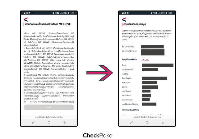 3. จะแสดงข้อตกลงและเงื่อนไขการใช้บริการ ME MOVE ให้เราอ่านก่อนนะคะ เมื่ออ่านและกดยอมรับข้อตกลงก็จะมีให้เราตรวจสอบข้อมูลส่วนตัวค่ะ