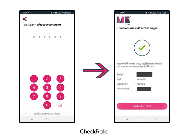 4. เมื่อตรวจสอบเรียบร้อยเราสามารถกดยืนยันข้อมูล >> ระบบจะเข้าสู่หน้าให้เราใส่ Password เพื่อยืนยันการเปิดบัญชีค่ะ >> จะมีหน้าจอยืนยันการเปิดบัญชี ME MOVE สมบูรณ์ หมายถึงว่าเราเปิดบัญชี ME MOVE เรียบร้อยแล้วนะคะ
