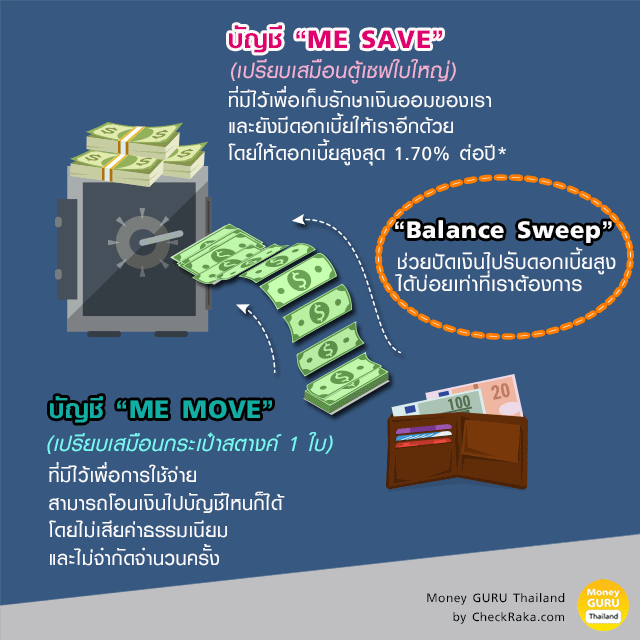พูดง่ายๆ คือ ใครเน้นใช้ต้องมีบัญชี ME MOVE ส่วนใครเน้นเก็บ และได้ดอกเบี้ยสูงต้องมีบัญชี ME SAVE แต่ที่ดียิ่งกว่าคือ หากเราใช้ทั้ง 2 บัญชี ในบัญชี ME MOVE แม้จะไม่มีดอกเบี้ยเงินฝาก แต่จะมีฟังก์ชันใหม่ Balance Sweep ที่ทำให้เราสามารถตั้งค่าการโอนเงินคงเหลือ ตามระยะเวลาที่เรากำหนดไว้ จากบัญชี ME MOVE เข้ามาเก็บไว้ในบัญชี ME SAVE เพื่อรับดอกเบี้ยสูงได้ ทำให้เราไม่ต้องเสียโอกาสในการรับดอกเบี้ย และในบัญชี ME MOVE เราก็สามารถทำธุรกรรมต่างๆ ได้โดยไม่ต้องเสียค่าธรรมเนียม