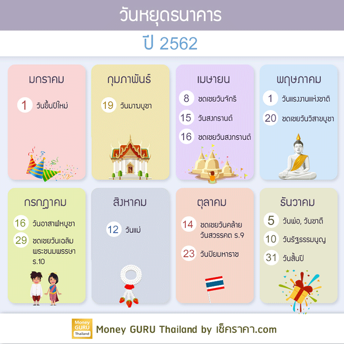 มาแล้วค่า ...วันหยุดตามประเพณีของสถาบันการเงิน ประจำปี พ.ศ. 2562 ตามที่ธนาคารแห่งประเทศไทยประกาศมาล่าสุด มีวันหยุดทั้งหมด 15 วัน ค่ะ โดยถือให้เป็นวันหยุดทำธุรกรรมทางการเงินสำหรับธนาคารสาขาปกติ ซึ่งจะปิดให้บริการ เว้นแต่ สาขาของธนาคารที่อยู่ในห้างสรรพสินค้าที่ส่วนใหญ่จะเปิดให้บริการกันทุกวัน ไม่มีวันหยุด (ทั้งนี้ จะขึ้นอยู่กับเงื่อนไขที่แต่ละธนาคารกำหนดไว้) เราลองมาดูกันค่ะ ว่ามีวันหยุดวันไหนบ้าง และมีวันหยุดไหนที่ติดกับวันเสาร์-อาทิตย์ และเป็นวันหยุดยาวบ้าง ดูแล้วจะได้ไม่ไปธนาคารเก้อ หรือจะวางแพลนไปเที่ยวกันยาวๆ นะคะ :)