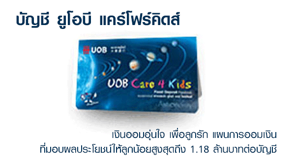 - บัญชีเงินฝากประจำ ปลอดภาษียูโอบีแคร์โฟร์คิดส์ เป็นบัญชีเงินฝากที่จะได้รับความคุ้มครองอุบัติเหตุในระยะเวลา 24 เดือน ของการฝากเงิน โดยไม่ต้องเสียค่าเบี้ยประกัน ได้รับวงเงินชดเชยอุบัติเหตุ 2 เท่าของจำนวนเงินที่จะต้องฝาก หรือสูงสุด 1,180,000 บาท ต่อบัญชี