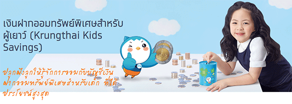 - บัญชีเงินฝากออมทรัพย์พิเศษสำหรับผู้เยาว์ (KTB Kids Savings) เป้นบัญชีเงินฝากสำหรับผู้เยาว์ สามารถเปิดได้คนละ 1 บัญชีเท่านั้น และหลังจากอายุ 15 ปี บัญชีออมทรัพย์พิเศษสำหรับผู้เยาว์จะเปลี่ยนเป็นบัญชีออมทรัพย์ปกติ