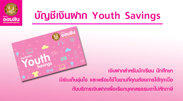 - บัญชีเงินฝาก Youth Savings เป็นบัญชีเงินฝากสำหรับนักเรียน นักศึกษา (อายุ 7 - 23 ปีบริบูรณ์) มีเงินเก็บอุ่นใจ และพร้อมใช้ในยามที่คุณต้องการได้ทุกเมื่อ กับบริการเงินฝากเผื่อเรียก บุคคลธรรมดาไม่หักภาษี (ผู้ฝาก 1 ราย เปิดบัญชีได้เพียง 1 บัญชี เท่านั้น)