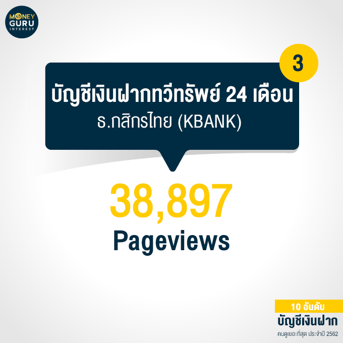 อันดับ 3 "บัญชีเงินฝากทวีทรัพย์ 24 เดือน" ธนาคารกสิกรไทย (KBANK) : 38,897 Pageviews