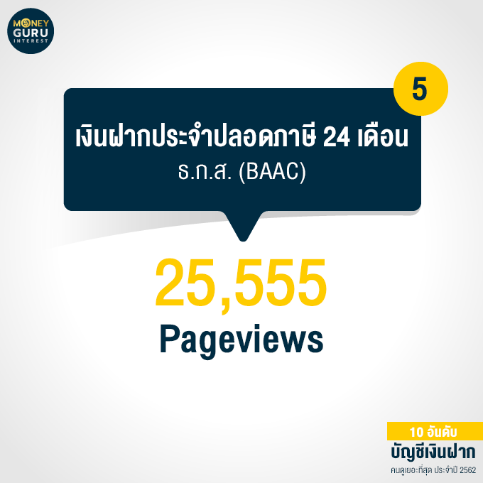 อันดับ 5 "บัญชีเงินฝากประจำปลอดภาษี 24 เดือน" ธ.ก.ส. (BAAC) : 25,555 Pageviews