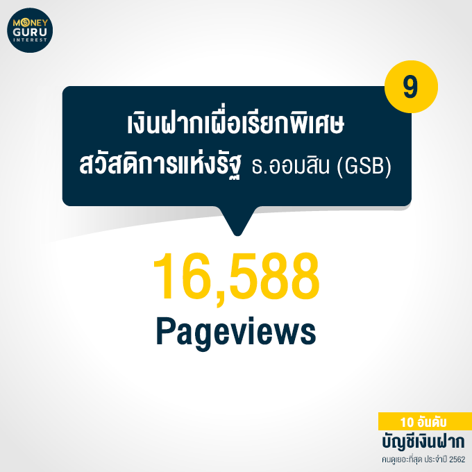 อันดับ 9 "บัญชีเงินฝากเผื่อเรียกพิเศษสวัสดิการแห่งรัฐ" ธนาคารออมสิน (GSB) : 16,588 Pageviews