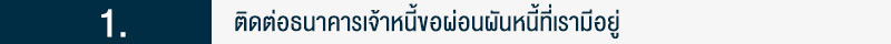 ให้เช็คเลยว่าตอนนี้เรามีค่าใช้จ่ายก้อนใหญ่ๆ หรือรายเดือนอะไรบ้าง เช่น หนี้บัตรเครดิต, สินเชื่อส่วนบุคคลที่เคยกู้มา, ค่าสมาชิกฟิตเนสที่หักบัตรเครดิตทุกเดือน, ค่าผ่อนรถ, ค่าผ่อนบ้าน ตรวจสอบว่าในแต่ละเดือนจะมีค่าใช้จ่ายอะไรที่จำเป็นต้องจ่ายบ้าง และที่สามารถลดได้ รวมถึงหนี้สินที่คงเหลืออยู่ว่ามีสถานะเท่าใด เพื่อให้ทราบถึงสุขภาพการเงินปัจจุบัน และหลังจากนั้นก็ศึกษาข้อมูลแต่ละธนาคารที่เราเป็นหนี้อยู่ ว่าแต่ละธนาคารมีอะไรผ่อนผัน หรือพักการชำระหนี้อะไรให้เราบ้าง ซึ่งเราดูเพิ่มเติมได้ตามด้านล่างนี้เลย