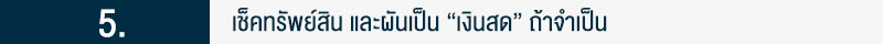 ช่วงนี้เราต้องเช็คดูว่าเรามีสมบัติอะไรบ้าง ทรัพย์สินมีทั้งก่อให้เกิดรายได้ และไม่ก่อให้เกิดรายได้ โดยเราอาจแยกทรัพย์สินที่ก่อให้เกิดรายได้เป็น 2 ส่วน คือ ทรัพย์สินที่มีสภาพคล่อง และทรัพย์สินที่ไม่มีสภาพคล่อง ซึ่งพวกที่มีสภาพคล่อง เช่น ทองคำ กองทุน กระเป๋าแบรนด์เนมที่เคยซื้อไว้ หรือนาฬิกาสะสม เป็นต้น ของพวกนี้ ถ้าจำเป็นจริงๆ ก็คงต้องเอาไปขาย หรือจำนำเพื่อเอาเงินสดมาใช้ชีวิตเลี้ยงดูครอบครัวก่อน หรือจะเข้าไปประกาศขายใน Facebook ที่เป็น Market Place ใหม่ๆ ก็ได้ เช่น ม.กรุงทพมาร์เก็ตเพลส หรือจุฬามาร์เก็ตเพลส เป็นต้น